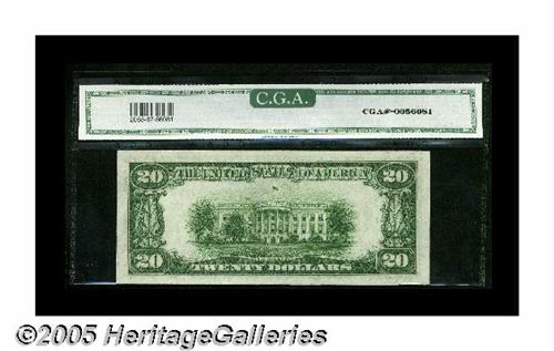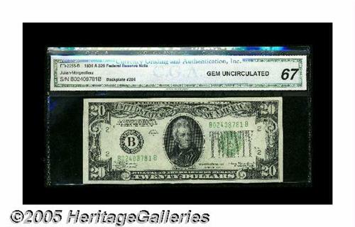 <B>Fr. 2055-B $20 Late Finished Back Plate 204 1934A Federal Reserve Note. CGA Gem Uncirculated 67.</B></I><BR>This $20 is from back plate 204 that was begun on December 21, 1934, sat in the plate vault for almost ten years, and not finished until March 18, 1944. This chain of events produced a back plate with a macro-sized back plate number. Back plate 204 should have had a micro back plate number since it was begun during the micro era. This note is a new B-B block low serial number for the Oakes reference, with this delightful example possessing broad margins, embossing, and perfect centering. These storied notes are seldom found in this lofty state of preservation.