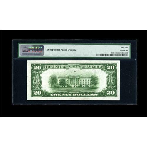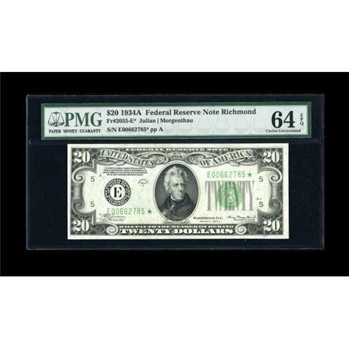 <B>Fr. 2055-E* $20 1934A Federal Reserve Note. PMG Choice Uncirculated 64 EPQ.</B></I><BR> A slight skew at lower left is noticed and most likely what caused the grade. This piece is one note back of the highest serial number known and is well margined and deeply inked.<BR><BR><b>Shipping:</b> Coins & Currency (<a target="_blank" href="http://www.heritageauctions.com/common/shipping.php">view shipping information</a>)