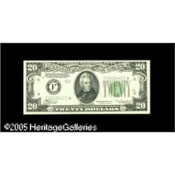 <B>Fr. 2055-F* $20 1934A Federal Reserve Note. Choice Crisp Uncirculated.</B></I><BR>Here is a new high for the census that is only kept from a higher grade by its top margin. Lot:16127