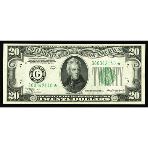 <B>Fr. 2055-G* $20 1934A Mule Federal Reserve Note. PCGS Gem New 65PPQ.</B></I><BR>An exceptionally fresh example of an extremely scarce star. With the imprimatur of PCGS attesting to its quality, this premium item should sell comfortably in the range of...