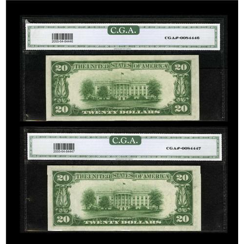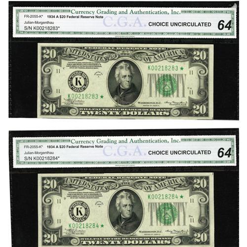 <B>Fr. 2055-K* $20 1934A Federal Reserve Notes. Two Consecutive Examples CGA Choice Uncirculated 64.</B></I><BR>These Dallas replacement notes are well margined and pack fresh.
