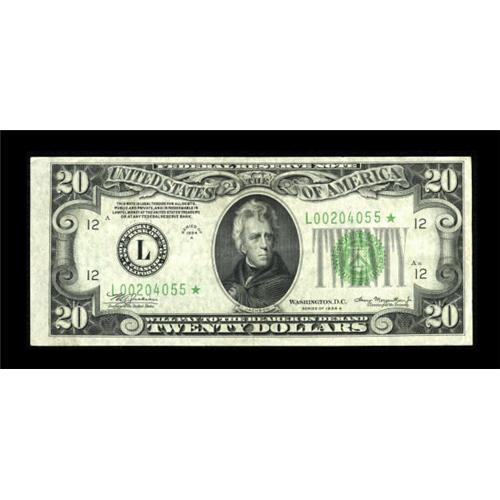 <B>Fr. 2055-L* $20 1934A Mule Federal Reserve Note. Extremely Fine.</B></I><BR> Only three districts are reported for known mule stars in this scarce series, with the San Francisco district one of them. This is a nice evenly circulated example which catalogues in the Schwartz reference at $400 in VF. Expect a realization in the area of.. <BR><BR><b>Shipping:</b> Coins & Currency (<a target="_blank" href="http://www.heritageauctions.com/common/shipping.php">view shipping information</a>)