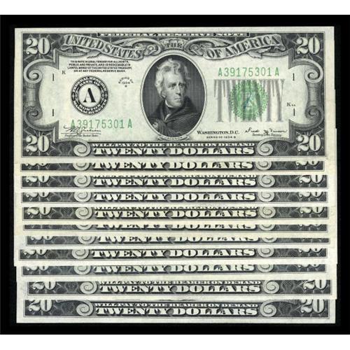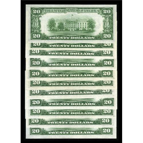 <B>Fr. 2056-A-J; L $20 1934B Federal Reserve Notes. Choice Crisp Uncirculated or Better.</B></I><BR> Several gems are found within this near complete district set.<BR><I>From The Thomas M. Flynn Collection</B></I><BR><BR><b>Shipping:</b> Coins & Currency (<a target="_blank" href="http://www.heritageauctions.com/common/shipping.php">view shipping information</a>)