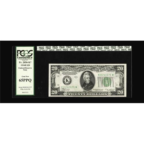 <B>Fr. 2056-K* $20 1934B Federal Reserve Star Note. PCGS Gem New 65PPQ.</B></I><BR>This note is only 28 notes from the lowest recorded serial on this scarce Dallas district.