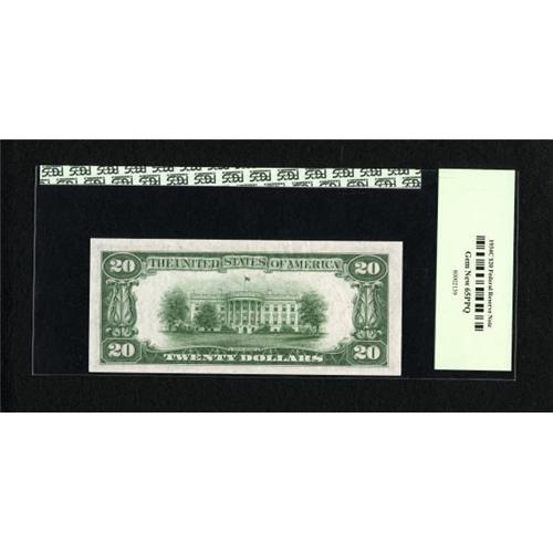 <B>Fr. 2057-B* $20 1934C Federal Reserve Note. PCGS Gem New 65PPQ.</B></I><BR> This wonderfully original "Old Back" replacement has the distinction of carrying the highest serial number known in the Schwartz/Lindquist guide.<BR><BR><b>Shipping:</b> Coins & Currency (<a target="_blank" href="http://www.heritageauctions.com/common/shipping.php">view shipping information</a>)