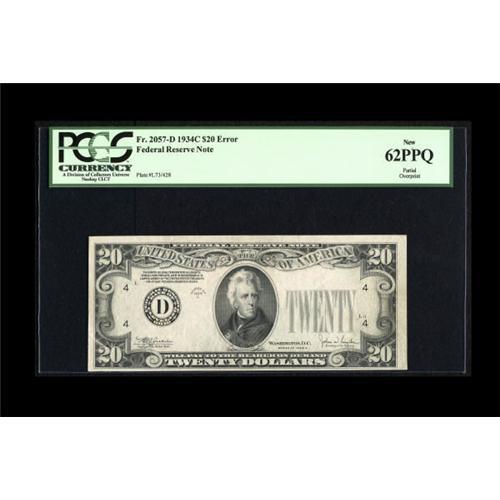 <B>Fr. 2057-D $20 1934C Federal Reserve Note. PCGS New 62PPQ.</B></I><BR> This early $20 FRN is missing the green portion of the overprint. To date we know of no others of this type. The embossing remains solid on the black portion of the overprint over crisp, bright paper.<BR><BR><b>Shipping:</b> Coins & Currency (<a target="_blank" href="http://www.heritageauctions.com/common/shipping.php">view shipping information</a>)