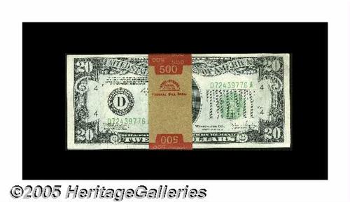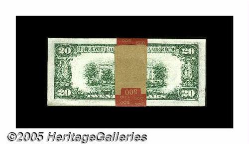 <B>Fr. 2057-D $20 1934C Federal Reserve Notes. Twenty-five Examples. Choice Crisp Uncirculated.</B></I><BR>A corner fold is found on this grouping that has been bank wrapped.<BR>