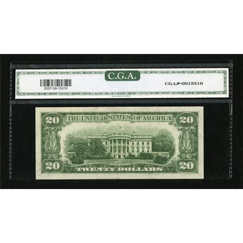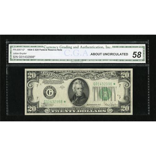 <B>Fr. 2057-G* $20 1934C Federal Reserve Note. CGA About Uncirculated 58.</B></I><BR> This pleasing note just misses as it is ever so lightly handled.<BR><BR><b>Shipping:</b> Coins & Currency (<a target="_blank" href="http://www.heritageauctions.com/common/shipping.php">view shipping information</a>)