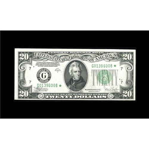 <B>Fr. 2057-G $20 1934C Federal Reserve Note. Choice Crisp Uncirculated.</B></I><BR>A pleasing uncirculated note that needs a little more bottom margin for a better grade.