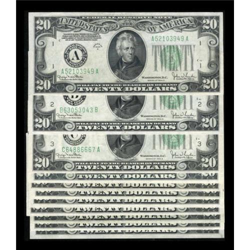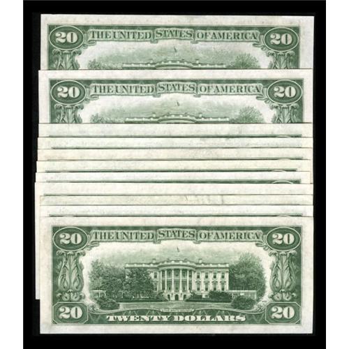 <B>Fr. 2058-A-C; E-L $20 1934D Federal Reserve Notes. Choice Crisp Uncirculated or Better.</B></I><BR> The Boston $20 weighs in at <B>About Uncirculated</B></I>.<BR><I>From The Thomas M. Flynn Collection</B></I><BR><BR><b>Shipping:</b> Coins & Currency (<a target="_blank" href="http://www.heritageauctions.com/common/shipping.php">view shipping information</a>)