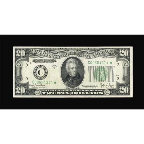 <B>Fr. 2058-C* $20 1934D Federal Reserve Note. Gem Crisp Uncirculated.</B></I><BR>In the latest Schwartz reference, there is no price listed, due to the recently discovered Wide and Narrow back variety, of which this is a Wide. This note did realize $517 in our 2005 FUN sale, so, we'll use that as a reference point.<BR><BR><b>Shipping:</b> Coins & Currency (<a target="_blank" href="http://www.heritageauctions.com/common/shipping.php">view shipping information</a>)