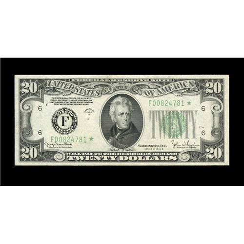 <B>Fr. 2058-F* $20 1934D Federal Reserve Star Note. Choice Crisp Uncirculated.</B></I><BR>This is the first time this note has graced our auction pages. It has decent margins with bright color and excellent embossing.