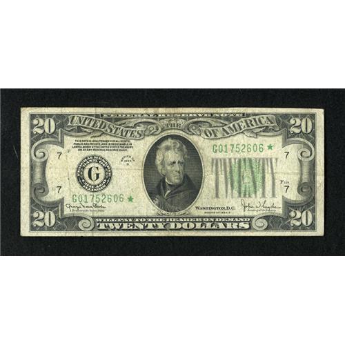 <B>Fr. 2058-G* $20 1934D Narrow Federal Reserve Note. Fine.</B></I><BR>In the Schwartz 7th edition there is no actual pricing information for the newly discovered Narrow variety on a replacement note. The scroll work differs in size causing this new sub-type for the Series.<BR><BR><I>From The Bill and Kathy Stella Currency Collection</B></I><BR><BR><b>Shipping:</b> Coins & Currency (<a target="_blank" href="http://www.heritageauctions.com/common/shipping.php">view shipping information</a>)