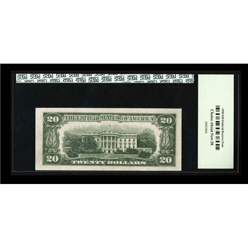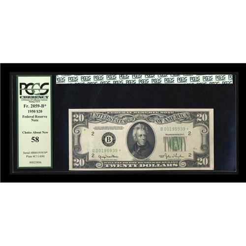 <B>Fr. 2059-B* $20 1950 Federal Reserve Note. PCGS Choice About New 58.</B></I><BR>Here is a decent replacement note has a slight skin on the back hence the grade.
