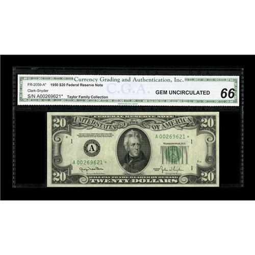 <B>Fr. 2059-G* $20 1950 Federal Reserve Note. CGA Gem Uncirculated 67.</B></I><BR>A very well margined example of this challenging star that comes from the Taylor Family Collection.<BR><BR><b>Shipping:</b> Coin/Currency (<a target="_blank" href="http://www.heritageauctions.com/common/shipping.php">view shipping information</a>)
