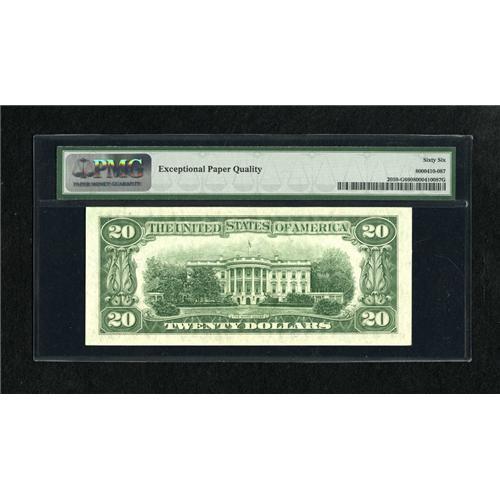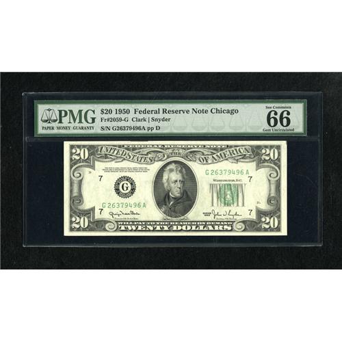 <B>Fr. 2059-G $20 1950 Federal Reserve Note. PMG Gem Uncirculated 66 EPQ.</B></I><BR>A broadly margined and well embossed example of this FRN series.<BR><BR><b>Shipping:</b> Coins & Currency (<a target="_blank" href="http://www.heritageauctions.com/common/shipping.php">view shipping information</a>)