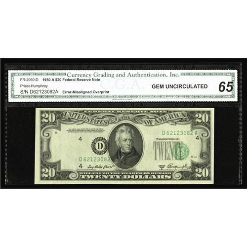 <B>Fr. 2060-D $20 1950A Federal Reserve Note. CGA Gem Uncirculated 65.</B></I><BR>The shifted third printing is skewed significantly to the right and even into the portrait of Jackson and the right margin side design.