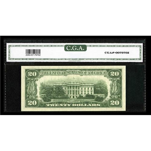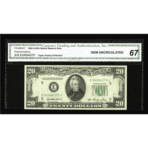 <B>Fr. 2060-E* $20 1950A Federal Reserve Note. CGA Gem Uncirculated 67.</B></I><BR>This lovely Richmond replacement note hails from the Taylor Family Collection. Wide, even margins are enveloping well embossed, bright surfaces.