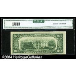 Fr. 2061-G* $20 1950-B Federal Reserve Note. CGA Choice <B>Fr. 2061-G* $20 1950B Federal Reserve Note. CGA Choice Uncirculated 64.</B></I><BR>We see no reason to dispute the third party grade applied to this scarce modern Star. <BR><BR><B>Important notice:</B> Heritage usually auctions material at the rate of 200-250 lots per hour. On some occasions eBay Live bid software or the Internet may not be able to keep up with the pace of the auction. We recommend placing a realistic absentee bid now as insurance to avoid disappointment. Occasionally the auctioneer may eliminate or reject an eBay Live bid, and the auctioneer may also reopen a lot after the close of the eBay live bidding (usually because we missed an audience bid), and may reject your bid even if it shows you as the winning bidder. By bidding via eBay Live, you agree that Heritage may award the lot to another bidder at its sole discretion under the circumstances described above or any other reasonable circumstances. Since eBay bids are not shown to us until we open the lot on the floor, we treat those bids just like floor bids. In most cases the floor responds before the eBay bid is presented to us, due to Internet lag time, so for consistency we have made it a policy that floor bids are always considered first over tie eBay live bids. Also please note that all Heritage lots purchased through eBay Live carry a 20% Buyer's Premium. Please make sure you read the Terms and Conditions before you bid. This lot is being auctioned in conjunction with a live floor auction by Heritage Galleries & Auctioneers. All final auction and invoice information will be supplied by Heritage Galleries & Auctioneers, and all other information should be considered preliminary. Lot:16391