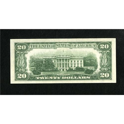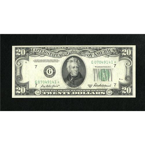 <B>Fr. 2061-G* $20 1950B Federal Reserve Note. Crisp Uncirculated.</B></I><BR>From our 2003 St. Louis Signature sale where the description read, "A fresh and nicely centered star, likely to realize very close to the Oakes catalogue valuation of $350." Catalog value has come down a touch since then but this note should generate some bidder interest.<BR><BR><b>Shipping:</b> Coins & Currency (<a target="_blank" href="http://www.heritageauctions.com/common/shipping.php">view shipping information</a>)