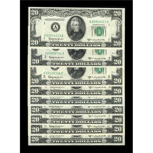 <B>Fr. 2063-A; C; E-I; K; L $20 1950D Federal Reserve Notes. Choice Crisp Uncirculated or Better.</B></I><BR> These $20s are well preserved.<BR><I>From The Thomas M. Flynn Collection</B></I><BR><BR><b>Shipping:</b> Coins & Currency (<a target="_blank" href="http://www.heritageauctions.com/common/shipping.php">view shipping information</a>)