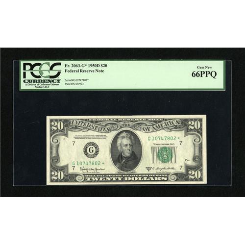 <B>Fr. 2063-G* $20 1950D Federal Reserve Note. PCGS Gem New 66PPQ.</B></I><BR>Enormous margins and sublime original paper surfaces are noted on this delightful Chicago star.<BR><I>From The Bill and Kathy Stella Currency Collection</B></I><BR><BR><b>Shipping:</b> Coins & Currency (<a target="_blank" href="http://www.heritageauctions.com/common/shipping.php">view shipping information</a>)