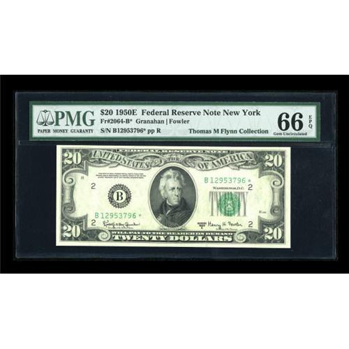 <B>Fr. 2064-B* $20 1950E Federal Reserve Note. PMG Gem Uncirculated 66 EPQ.</B></I><BR> A gorgeous star note from the New York district, one of only three to issue in this series. PMG has graded only three other New York star examples, two circulated and one a 67. <BR><I>From The Thomas M. Flynn Collection</B></I><BR><BR><b>Shipping:</b> Coins & Currency (<a target="_blank" href="http://www.heritageauctions.com/common/shipping.php">view shipping information</a>)