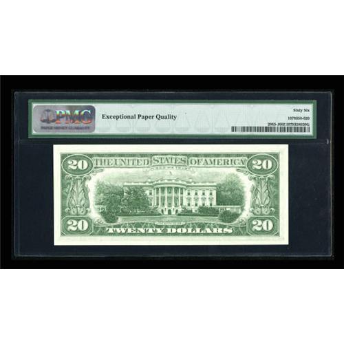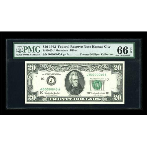 <B>Fr. 2065-J $20 1963 Federal Reserve Note. PMG Gem Uncirculated 66 EPQ.</B></I><BR> A perfectly centered example bearing low serial number J00000045A.<BR><I>From The Thomas M. Flynn Collection</B></I><BR><BR><b>Shipping:</b> Coins & Currency (<a target="_blank" href="http://www.heritageauctions.com/common/shipping.php">view shipping information</a>)