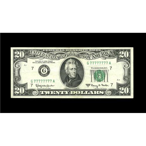 <B>Fr. 2066-G $20 1963A Federal Reserve Note. Extremely Fine.</B></I><BR>This district 7 $20 has a serial number of all 7s.<BR><I>From The Bill and Kathy Stella Currency Collection</B></I><BR><BR><b>Shipping:</b> Coin/Currency (<a target="_blank" href="http://www.heritageauctions.com/common/shipping.php">view shipping information</a>)