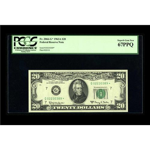 <B>Fr. 2066-G* $20 1963A Federal Reserve Note. PCGS Superb Gem New 67PPQ.</B></I><BR>Even the fussiest buyer will be unable to find a reason to quibble with the lofty and coveted grade assigned by PCGS. If you are forming a collection of the highest quality star notes available, this example merits your most serious consideration.<BR><I>From The Bill and Kathy Stella Currency Collection</B></I><BR><BR><b>Shipping:</b> Coin/Currency (<a target="_blank" href="http://www.heritageauctions.com/common/shipping.php">view shipping information</a>)