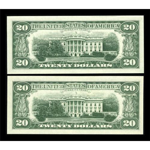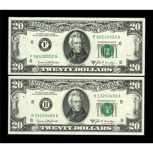 <B>Fr. 2069-F; H $20 1969B Federal Reserve Notes. Gem Crisp Uncirculated.</B></I><BR> Each note in this pair has ample margins and nice centering.<BR><I>From The Thomas M. Flynn Collection</B></I><BR><BR><b>Shipping:</b> Coins & Currency (<a target="_blank" href="http://www.heritageauctions.com/common/shipping.php">view shipping information</a>)