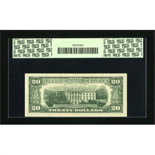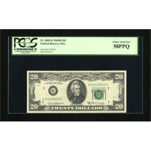 <B>Fr. 2069-G $20 1969B Federal Reserve Note. PCGS Choice About New 58PPQ.</B></I><BR> Embossing is noticed along with an edge pinch on this note from a tougher series.<BR><BR><b>Shipping:</b> Coins & Currency (<a target="_blank" href="http://www.heritageauctions.com/common/shipping.php">view shipping information</a>)