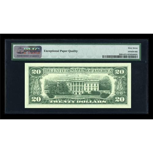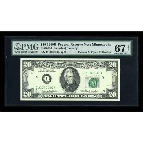 <B>Fr. 2069-I $20 1969B Federal Reserve Note. PMG Superb Gem Unc 67 EPQ.</B></I><BR> We would not normally list a non-star 1969B note as a single lot, but this is not your normal 1969B twenty. It comes from the scarcest district in a very scarce series, and is one of only two 1969B twenties to be graded Superb Gem 67 by PMG. The other was one of the 10 Chicago district notes PMG has graded. This comes from a district where the sole other example that PMG has graded to date was Extremely Fine 45. Any estimate here is just a guess, as this note will prove essential to future Registry Set collectors in the years to come. <BR><I>From The Thomas M. Flynn Collection</B></I><BR><BR><b>Shipping:</b> Coins & Currency (<a target="_blank" href="http://www.heritageauctions.com/common/shipping.php">view shipping information</a>)