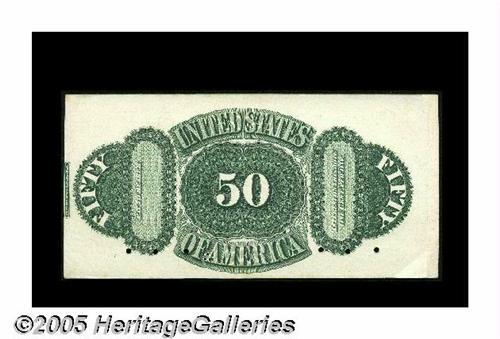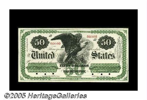 <B>Fr. 207 Hessler X129A (946) $50 1861 Interest Bearing Note Proof About New, PC.</B></I> This is a most desirable proof, in that individual face and back proofs printed on India paper have been mounted on an intervening piece of card stock. There is only one issued note known of this Friedberg number, and we recently sold that note in the Taylor Family Collection auction for $172,500. The serial number is all zeros on this plate letter A proof that hearkens back to pre-BEP days of our nation's paper money. The back lower left-hand corner shows two folds, while the back upper right-hand corner tip is lightly clipped. Also, there are six small punch cancels along the signature lines of this proof that states, "Interest One Cent Per Day." An item such as this only appears when great collections are sold.