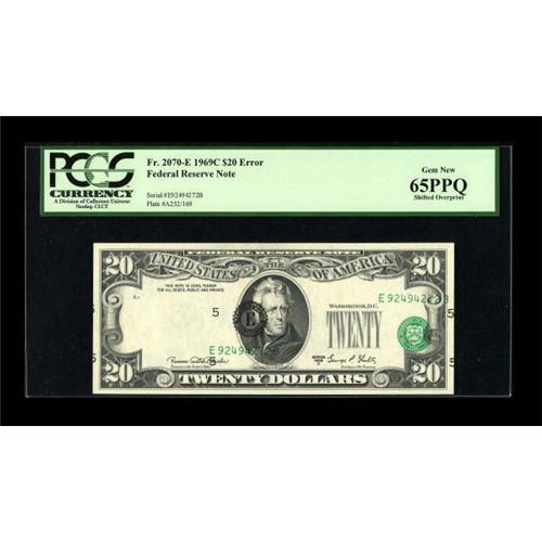 <B>Fr. 2070-E $20 1969C Federal Reserve Note. PCGS Gem New 65PPQ.</B></I><BR> The third print is shifted right off the note on this $20 FRN. Almost the whole district identifier is in the portrait area.<BR><BR><b>Shipping:</b> Coins & Currency (<a target="_blank" href="http://www.heritageauctions.com/common/shipping.php">view shipping information</a>)
