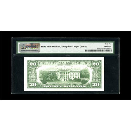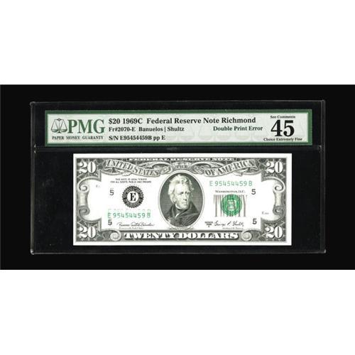 <B>Fr. 2070-E $20 1969C Federal Reserve Note. PMG Choice Extremely Fine 45 EPQ.</B></I><BR>This note exhibits a third print doubling error caused by "bounce" from the pneumatic print heads. The left side serial number can be seen twice.
