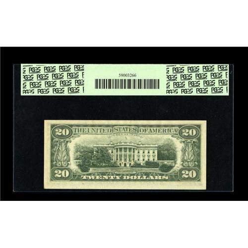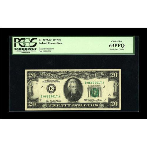 <B>Fr. 2072-B $20 1977 Federal Reserve Note. PCGS Choice New 63PPQ.</B></I><BR>This is a fantastic double printing $20. The doubling is pronounced across the entire note, showing doubled signatures, a pair of separate and distinct plate positions and numbers, and Jackson's facial features. This is a great error destined for a great collection.<BR><BR><b>Shipping:</b> Coins & Currency (<a target="_blank" href="http://www.heritageauctions.com/common/shipping.php">view shipping information</a>)