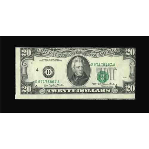 <B>Fr. 2072-D $20 1977 Federal Reserve Note. Choice Crisp Uncirculated.</B></I><BR> Portions of four different notes are visible due to the skewed face printing while the back remains normal. Highly desirable for type, it maintains deep inks with some embossing present. One of the nicest we have seen. <BR><BR><b>Shipping:</b> Coins & Currency (<a target="_blank" href="http://www.heritageauctions.com/common/shipping.php">view shipping information</a>)