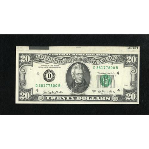 <B>Fr. 2072-D $20 1977 Federal Reserve Note. Choice Crisp Uncirculated.</B></I><BR> The top selvage from the sheet is retained by this Cleveland $20 FRN.<BR><BR><b>Shipping:</b> Coins & Currency (<a target="_blank" href="http://www.heritageauctions.com/common/shipping.php">view shipping information</a>)