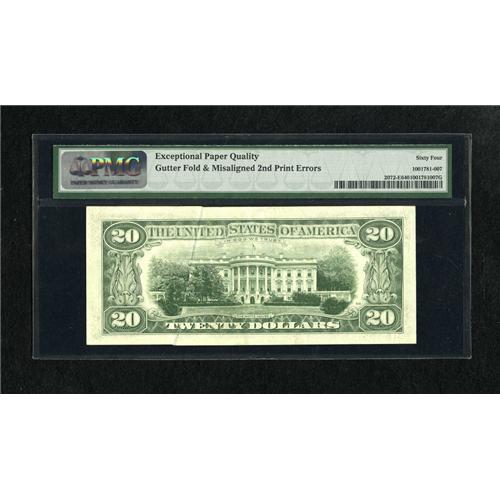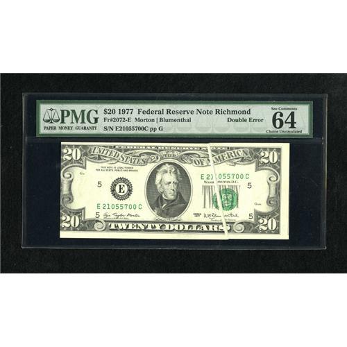 <B>Fr. 2072-E $20 1977 Federal Reserve Note. PMG Choice Uncirculated 64.</B></I><BR>The gutter fold may be the cause for the misalignment, but none the less it is a multiple error in high grade..<BR><BR><b>Shipping:</b> Coins & Currency (<a target="_blank" href="http://www.heritageauctions.com/common/shipping.php">view shipping information</a>)