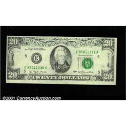 Fr. 2072-E $20 1977 Federal Reserve Note.<p>Gem Crisp Uncirculated. A nice example of inadequate inking on the first face printing. Important notice: We expect to be auctioning lots at the rate of 200-250 per hour. Sometimes eBay Premier live bid software cannot keep up with that pace, so we strongly recommend that you place a realistic proxy bid now as insurance to avoid disappointment. Also please note that all Heritage/CAA lots purchased through eBay Premier carry a 20% Buyer's Premium.