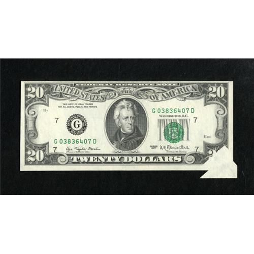 <B>Fr. 2072-G $20 1977 Federal Reserve Note. Choice Crisp Uncirculated.</B></I><BR> A neat corner foldover is noticed on this crisp $20 FRN.<BR><BR><b>Shipping:</b> Coins & Currency (<a target="_blank" href="http://www.heritageauctions.com/common/shipping.php">view shipping information</a>)