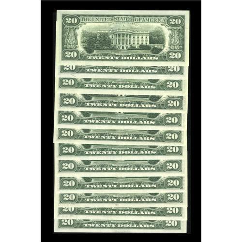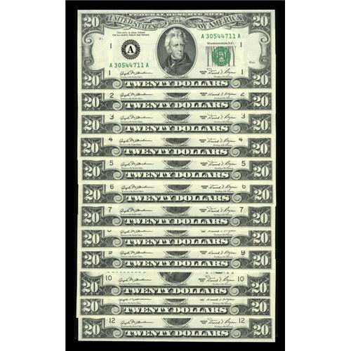 <B>Fr. 2073-A-G; H*; I-L $20 1981 Federal Reserve Notes. Choice Crisp Uncirculated or Better.</B></I><BR> The KC note has fancy serial number 18888888.<BR><I>From The Thomas M. Flynn Collection</B></I><BR><BR><b>Shipping:</b> Coins & Currency (<a target="_blank" href="http://www.heritageauctions.com/common/shipping.php">view shipping information</a>)