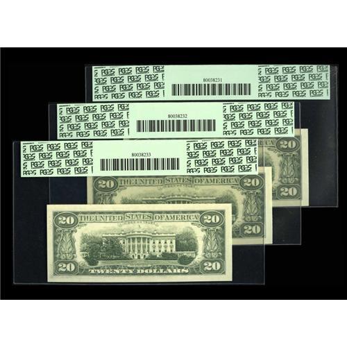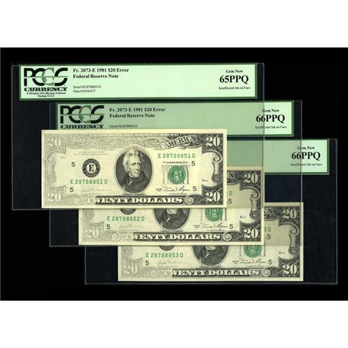 <B>Fr. 2073-E $20 1981 Federal Reserve Notes. Three Consecuitve Notes. PCGS Gem New 65PPQ; 66PPQ; 66PPQ.</B></I><BR>The left two-thirds of this high-grade trio has been inadequately inked.<BR><BR><b>Shipping:</b> Coins & Currency (<a target="_blank" href="http://www.heritageauctions.com/common/shipping.php">view shipping information</a>)