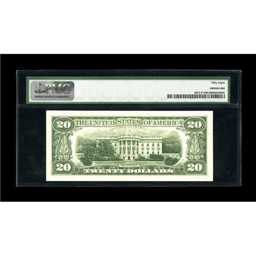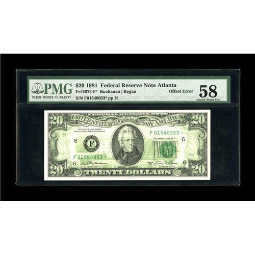 <B>Fr. 2073-F* $20 1981 Federal Reserve Note. PMG Choice About Unc 58.</B></I><BR>A relatively common error, but not so on a replacement note.<BR><BR><b>Shipping:</b> Coin/Currency (<a target="_blank" href="http://www.heritageauctions.com/common/shipping.php">view shipping information</a>)