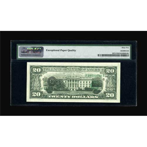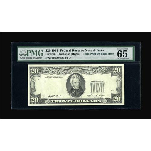 <B>Fr. 2073-F $20 1981 Federal Reserve Note. PMG Gem Uncirculated 65 EPQ.</B></I> Another in a high grade denomination set of third printing on reverse examples, all graded by PMG. <BR><BR><b>Shipping:</b> Coins & Currency (<a target="_blank" href="http://www.heritageauctions.com/common/shipping.php">view shipping information</a>)
