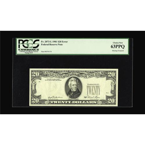 <B>Fr. 2073-L $20 1981 Federal Reserve Note. PCGS Choice New 63PPQ.</B></I><BR>The third printing is missing, but the embossing is strong and clearly shows a L district seal and several "12's."