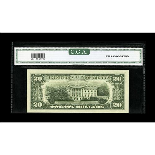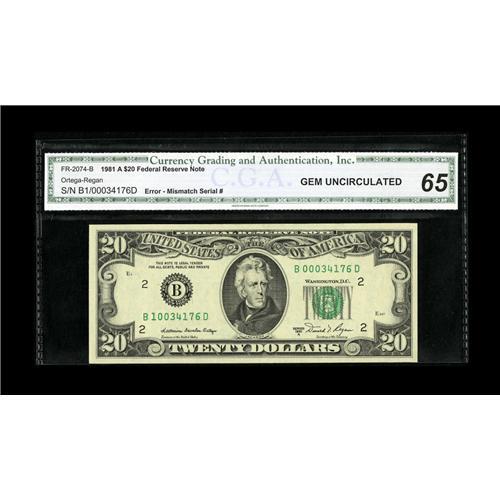 <B>Fr. 2074-B $20 1981A Federal Reserve Note. CGA Gem Uncirculated 65.</B></I><BR>We've only had an example of the B1/0 mismatch only once before.<BR><BR><b>Shipping:</b> Coin/Currency (<a target="_blank" href="http://www.heritageauctions.com/common/shipping.php">view shipping information</a>)