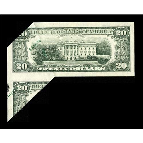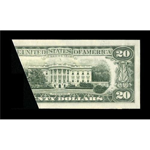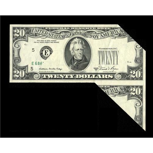 <B>Fr. 2074-E $20 1981A Federal Reserve Note. Gem Crisp Uncirculated.</B></I><BR>This is another wild cutting error. A large appendage of the adjacent note juts below the primary note on this cutting error. The right half of the note was folded over and it received part of the left-hand serial number and district seal on its back. The clipped upper right corner is in association with the making of this error, therefore it is not considered in the grading of the note. A most dramatic error, fit for the best of collections.<BR><BR><b>Shipping:</b> Coin/Currency (<a target="_blank" href="http://www.heritageauctions.com/common/shipping.php">view shipping information</a>)
