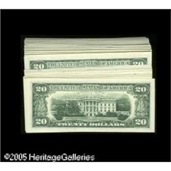 <B>Fr. 2075-A-L (62) $20 1985 Federal Reserve Notes. Choice Crisp Uncirculated or Better.</B></I><BR><B>Fr. 2075-A*-L* (11) $20 1985 Federal Reserve Notes. Complete Star District Set. Choice Crisp Uncirculated or Better.</B></I><BR><B>Fr. 2076-A (2), B, D, E (2), F, G (2), I, J (2), L (5) $20 1988A Federal Reserve Notes. Choice Crisp Uncirculated or Better.</B></I><BR><B>Fr. 2076-B*, F*, G* $20 1988A Federal Reserve Notes. Choice Crisp Uncirculated or Better.</B></I><BR>Over $1800 face graces this accumulation of blocks that has only a few notes less than Choice CU. Also, Atlanta and St. Louis did not issue 1985 stars, while the complete 1985 star set presented here has an additional New York star. That New York star and the Boston star tops the grading scale at XF. At last, serial number I00001300A inhabits the 1988A set.<BR> 93 notes Lot:16177